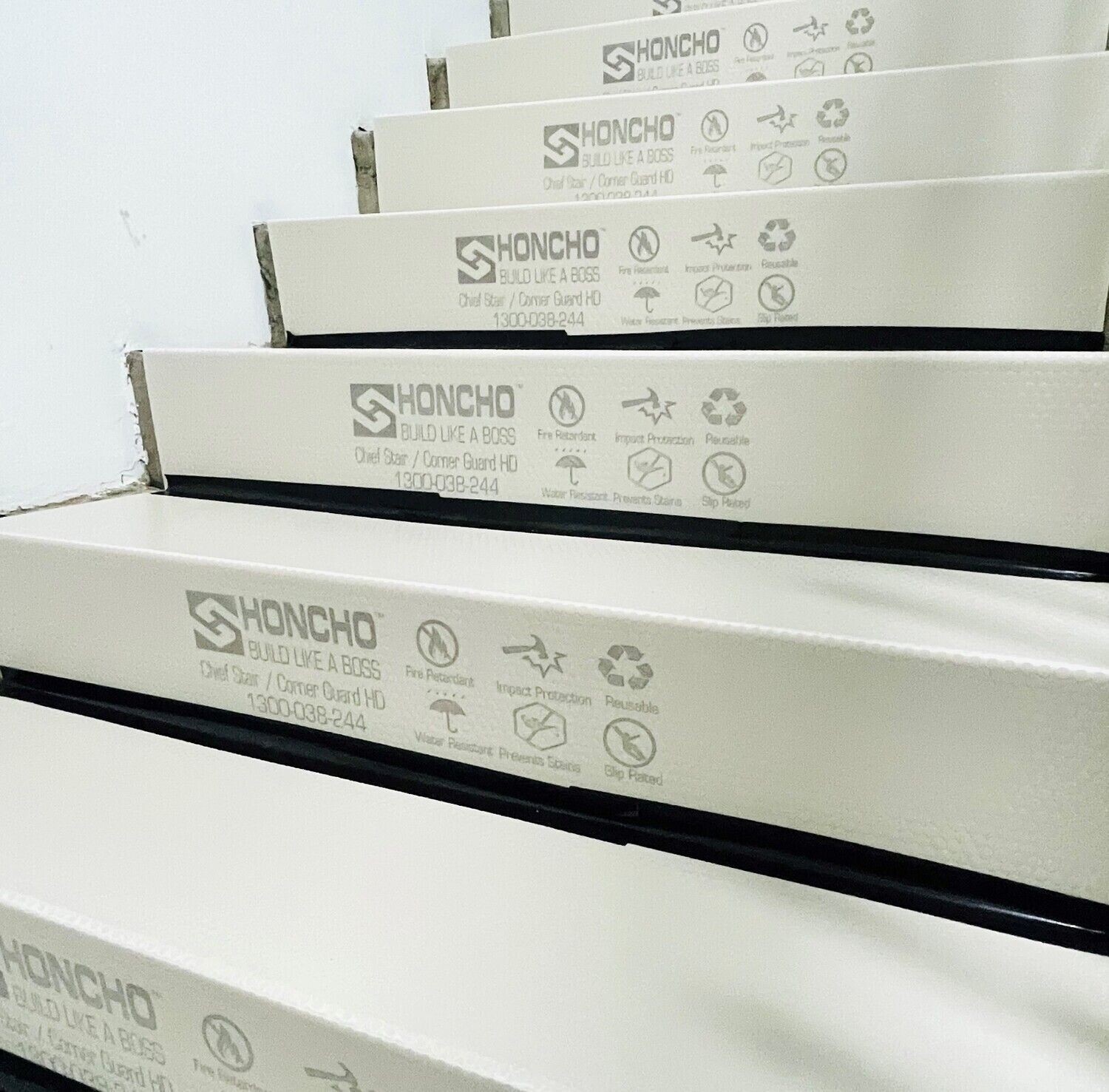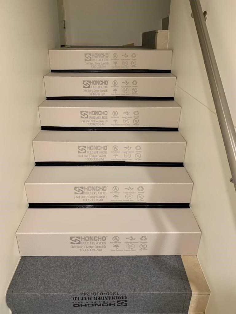 Honcho Stair/Corner Guard is lightweight, easy to install, and impact resistant. No more dents, cracks, scuff marks, and scratches on stairs and edges from carts, equipment, and general construction traffic Stair/Corner Guard HD has the same compression strength as Chief Board HD, ensuring safety in any facility it is used.